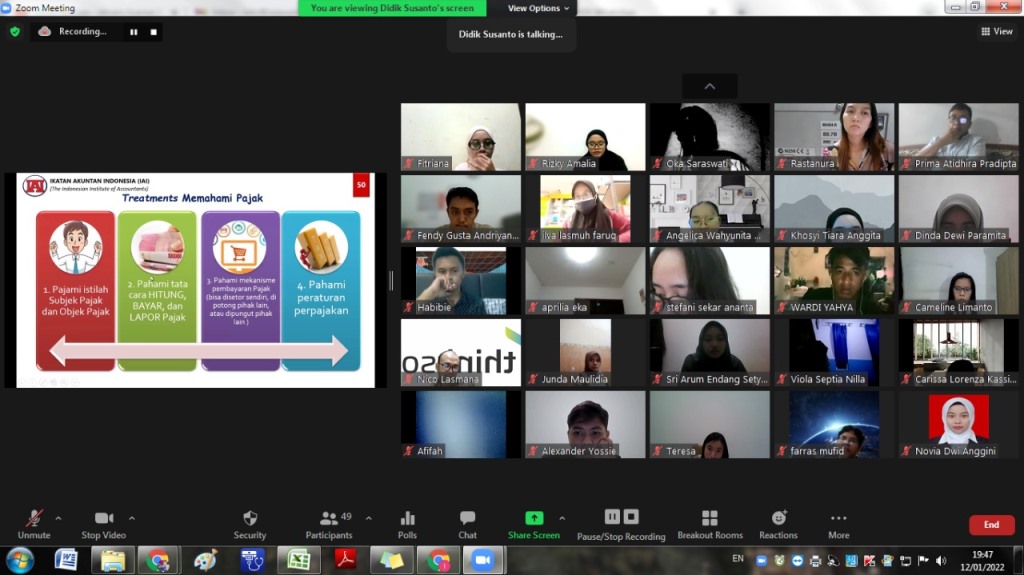 Surabaya (17/01) - IAI Jawa Timur kembali menghadirkan kelas pelatihan Brevet A&B Terpadu yang telah dimulai sejak tanggal 10 Januari 2022 lalu. Kelas pelatihan Brevet kali ini diadakan setiap hari Senin, Rabu dan Jumat pada pukul 18.30 sampai 20.30 yang diikuti oleh sebanyak 49 peserta. Durasi dari kelas pelatihan ini ialah selama 6 bulan dengan materi-materi yang berkualitas. Pertemuan pertama diawali dengan materi KUP A.