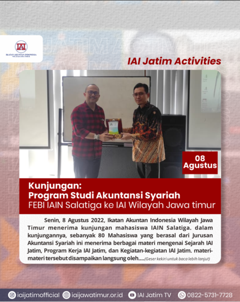 Senin, 8 Agustus 2022, Ikatan Akuntan Indonesia Wilayah Jawa Timur menerima kunjungan mahasiswa IAIN Salatiga. dalam kunjungannya, sebanyak 80 Mahasiswa yang berasal dari Jurusan Akuntansi Syariah ini menerima berbagai materi mengenai Sejarah IAI Jatim, Program Kerja IAI Jatim, dan Kegiatan-kegiatan IAI Jatim. materi-materi tersebut disampaikan langsung oleh pengurus IAI Jatim Bidang Pengembangan, Pengabdian Masyarakat, & Hubungan Masyarakat yang diantaranya adalah Fidelis Arastyo Andono S.E., Ak., M.M., Ph.D., Diana Suteja, S.E.,M.M.,AK.,CA, dan Dr. Achmad Maqsudi., M.Si., Ak., CA.
