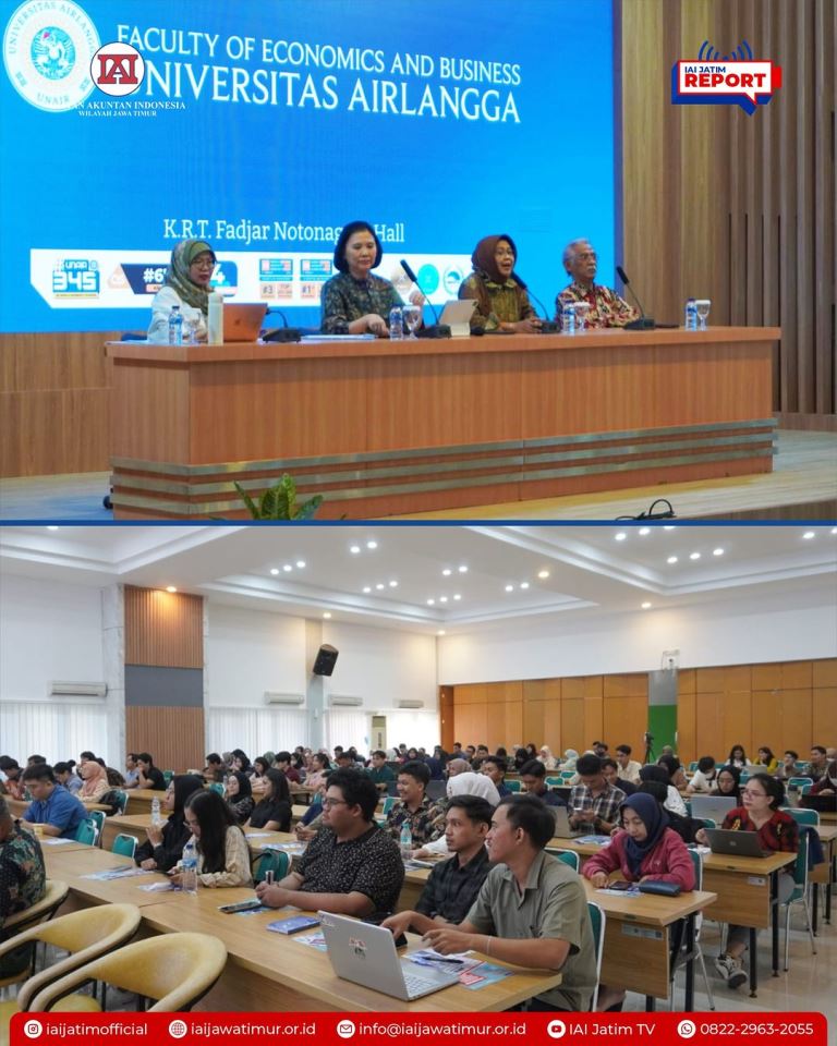 Surabaya, 29 Mei 2024 - Ikatan Akuntan Indonesia (IAI) mengadakan kegiatan "IAI Goes to UNAIR" di Aula Fadjar Notonegoro Universitas Airlangga (UNAIR) pada hari Rabu, 29 Mei 2024. Acara ini diikuti oleh 150 mahasiswa Fakultas Ekonomi dan Bisnis (FEB) UNAIR dan bertujuan untuk mensosialisasikan profesi akuntan dan program beasiswa Certified Accountant (CA) kepada Mahasiswa.