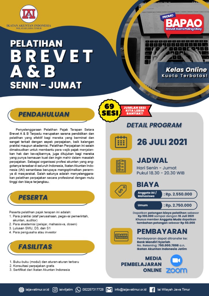 Telah dibuka pendaftaran kelas Online Brevet A dan B mulai kelas 26 Juli 2021 (Setiap Senin - Jumat) Pukul 18.30 – 20.30 WIB.