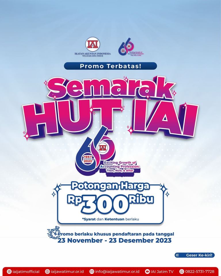 Dalam Rangka HUT ke-66 IAI, IAI Jawa Timur memberikan penawaran Promo Semarak HUT IAI dengan diskon berupa potongan harga sebesar Rp 300.000