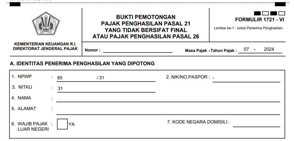 Selain itu, format cetak bukti potong juga telah diperbarui. Jika pihak yang dipotong sudah memiliki NPWP yang sesuai dengan NIK, kolom NPWP akan menampilkan NPWP 15 digit dan NIK. Selain itu, bagian identitas juga akan mencantumkan NITKU.