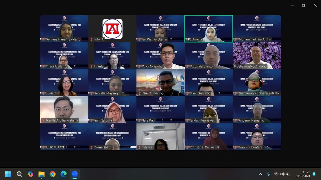 Surabaya, 31 Oktober 2024 – Ikatan Akuntan Indonesia (IAI) Wilayah Jawa Timur sukses menyelenggarakan Pendidikan Profesional Berkelanjutan (PPL) bertajuk "Teknik Forecasting dalam Akuntansi dan Fungsinya Bagi Bisnis." Seminar yang diadakan secara online via Zoom ini dihadiri oleh para profesional akuntansi, akademisi, dan mahasiswa yang bersemangat mempelajari teknik peramalan dalam akuntansi serta aplikasinya di dunia bisnis.