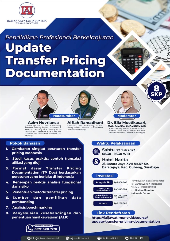IAI Wilayah Jawa Timur menyelenggarakan Pendidikan Profesional Berkelanjutan (PPL) Diskusi dengan tema Update Transfer Pricing Documentation dengan tujuan memberikan update mengenai Transfer Pricing Documentation. Lanskap perpajakan internasional dan transfer pricing terus mengalami perkembangan secara signifikan. Perubahan-perubahan yang terjadi membuat entitas usaha yang menjalankan transaksi intragrup perlu menyusun Transfer Pricing Documentation (TP Doc – dokumentasi transfer pricing) yang optimal. TP Doc saat ini menjadi hal yang sering dibahas dalam dunia perpajakan. TP Doc bukan merupakan instrumen untuk melakukan penghindaran pajak, tetapi memiliki tujuan memaksimalkan laba dari sebuah perusahaan dengan melalui penentuan harga barang maupun jasa oleh satu unit organisasi dari perusahaan terkait dengan organisasi lain, naun masih dengan perusahaan yang sama. Regulasi yang membuat TP Doc menjadi popular adalah PMK Nomor 213/PMK.03/2016 mengenai jenis dokumen atau informai tambahan yang wajib disimpan oleh wajib pajak yang melakukan transaksi dengan pihak yang memiliki hubungan istimewa, dan tata cara pengelolaannya. Di dalam TP Doc para wajib pajak berkewajiban untuk mengungkapkan pihak-pihak yang terafiliasi dengan wajib pajak, jenis transaksi yang dilakukan, dan besar transaksi yang dilakukan berdasarkan fakta dan kondisi yang sebenarnya atau dengan kata lain saat transaksi berlangsung dimulai dari awal periode. Saat ini, jika akan melakukan transaksi afiliasi dalam dengan batasan tertentu maka diwajibkan untuk mendokumentasikan TP Doc.